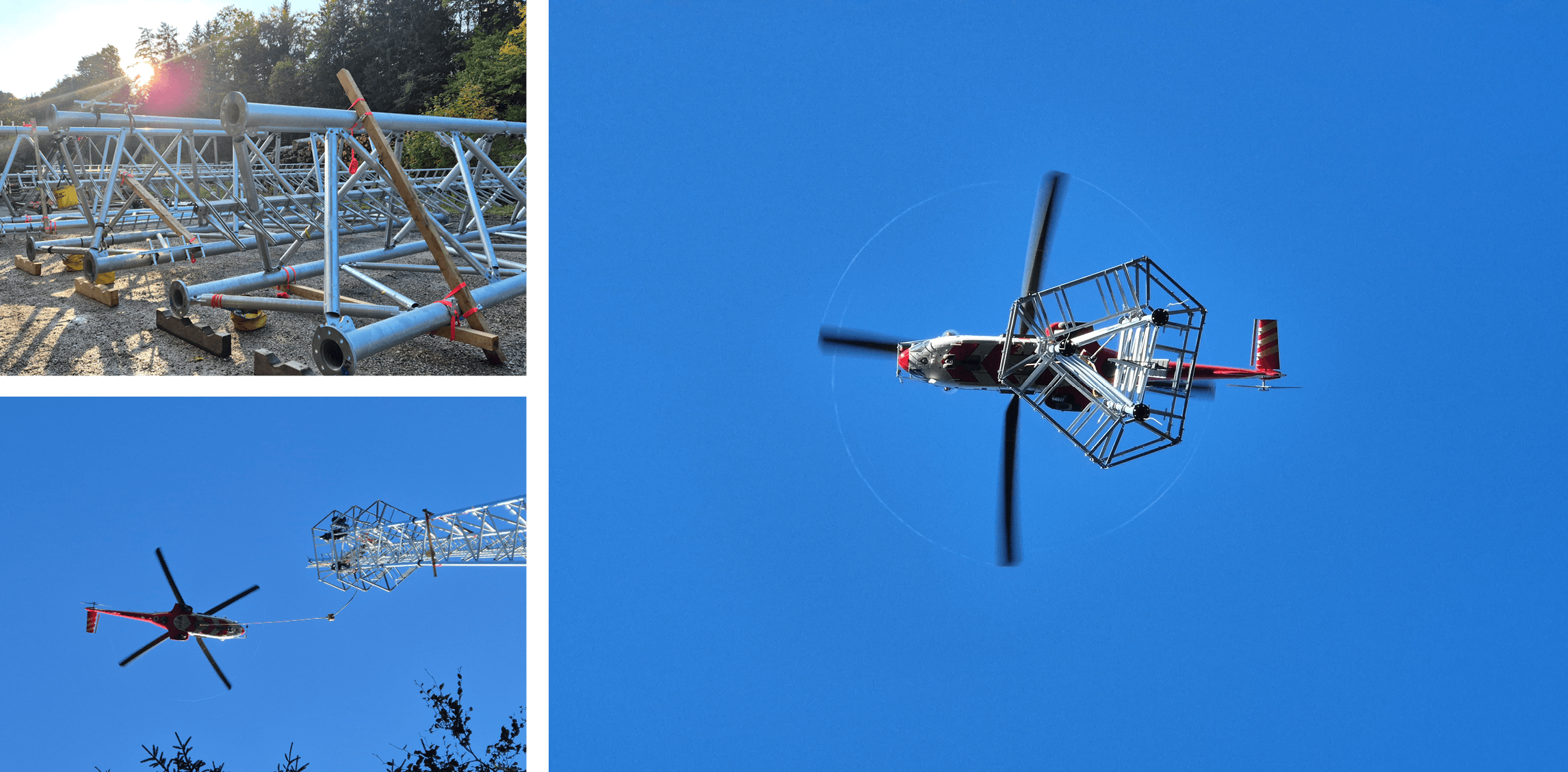 Für die Montage des Stahlbaus war erneut der Einsatz eines Transporthubschraubers vorgesehen. Diese Methode ermöglicht eine schnelle, geländeunabhängige Bauabwicklung, sodass der gesamte Mast an nur einem Arbeitstag aufgestellt werden konnte.