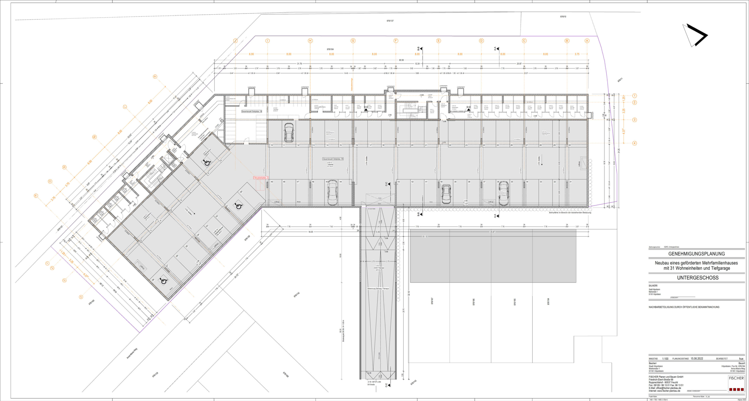 Die Ausarbeitung des Gebäudes ist durch die Vorgaben des Bebauungsplans genau festgelegt. Ein wichtiger Punkt war dabei, eine Tiefgarage für die Fahrzeuge der Bewohner vorzusehen. Insgesamt werden 58 Stellplätze für PKWs sowie 36 Stellplätze für Fahrräder errichtet.